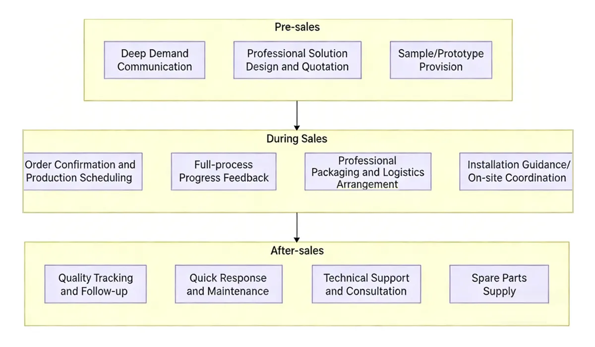 Sau khi xác nhận đơn hàng, YeHaoXuan sẽ bắt đầu lịch trình sản xuất chuyên dụng, cho phép bạn theo dõi tiến độ theo thời gian thực; Sau khi sản xuất, chúng tôi sử dụng cách đóng gói chuyên nghiệp và dịch vụ hậu cần đáng tin cậy, đồng thời cung cấp hướng dẫn lắp đặt và hỗ trợ cần thiết tại chỗ để đảm bảo quá trình giao sản phẩm diễn ra suôn sẻ.